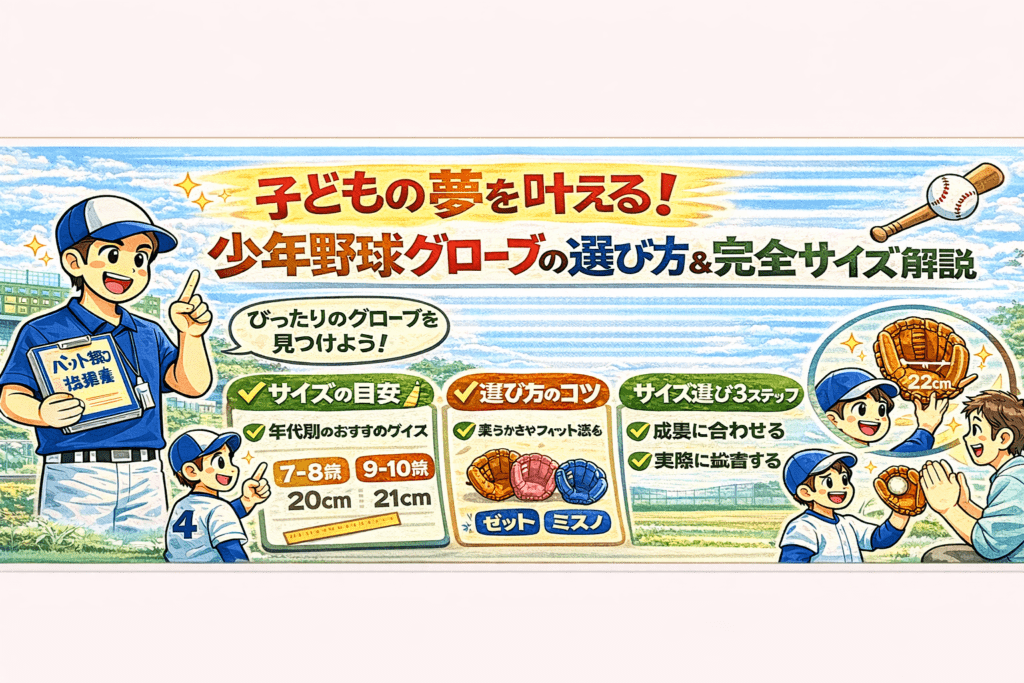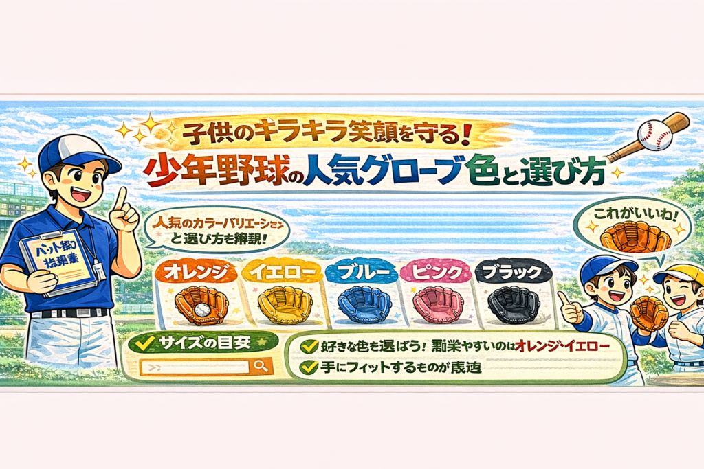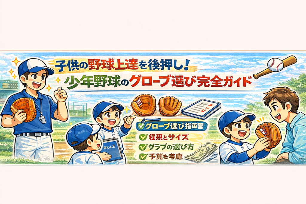 はじめに 少年野球を始めるにあたって、グローブの選び方は非常に重要です。適切なグローブを選ぶことで、子どもたちはプレーをより楽しめ、上達も早まります。本記事では、少年野球のグローブ選びについて詳しく解説します。サイズや素材、ポジション別の... -
