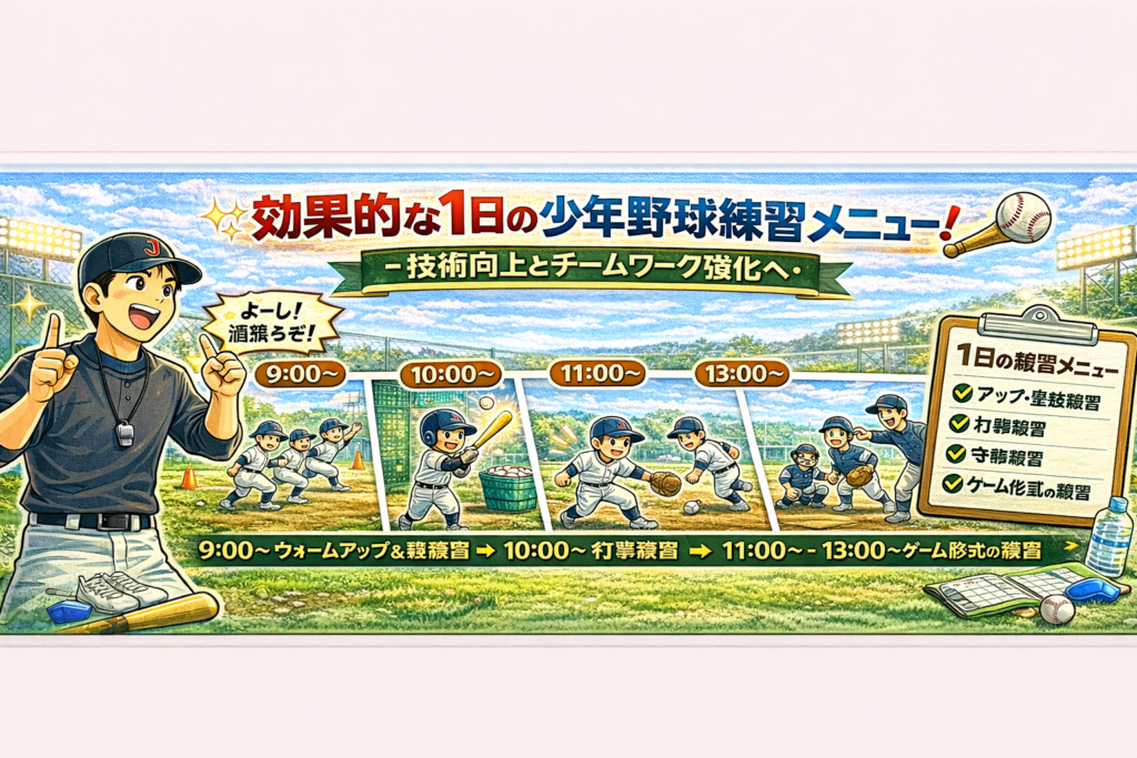 少年野球において、一日の練習メニューの計画は選手たちの技術向上とチームワークの強化において、非常に大切な役割を果たします。適切に組み立てられた練習プログラムは、子どもたちが野球の楽しさを実感しながら、より高いレベルでのプレーを目指せるよ... -