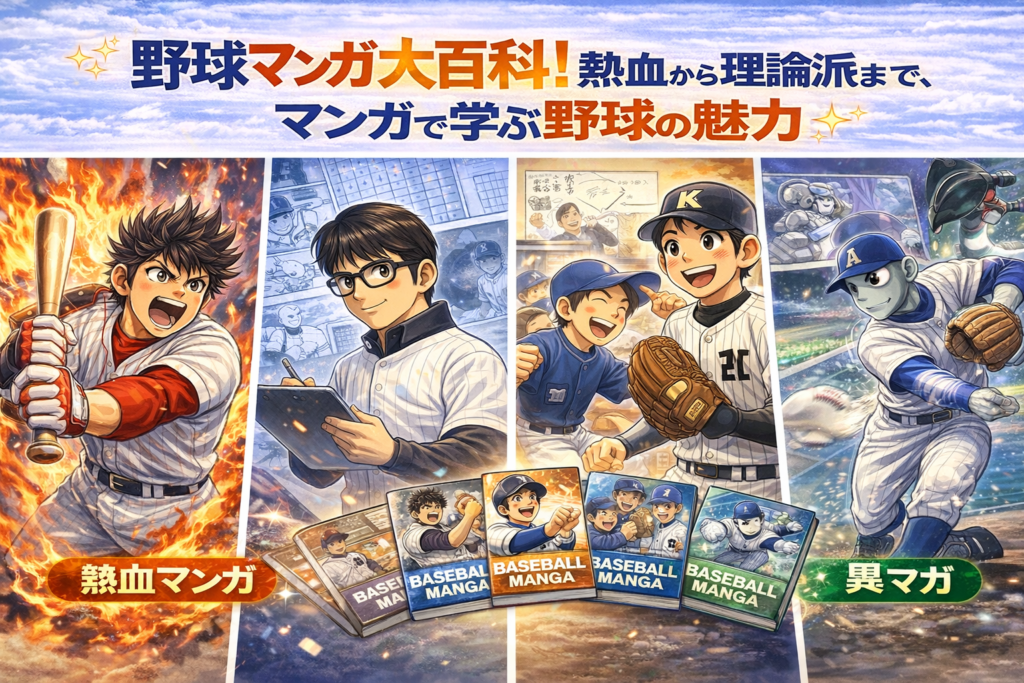 はじめに 野球マンガは日本の漫画文化において重要な位置を占めています。熱血漢の青春物語から理論派の監督視点まで、さまざまなジャンルの作品が存在し、幅広い読者層を魅了してきました。本日は野球マンガの魅力と代表作品を6つの観点から紹介します。... -