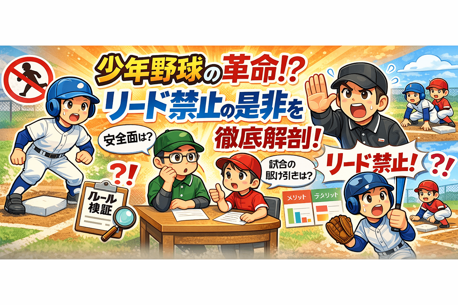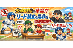少年野球界で現在盛んに議論されているテーマの一つに、「リード禁止」があります。本記事では、リード禁止という規制について、賛成派と反対派の意見を探りながら、盗塁禁止との違いやその背景、そして野球界が目指す方向性について考察していきます。子供たちが安全に楽しく野球を続けるための取り組みを一緒に見ていきましょう。