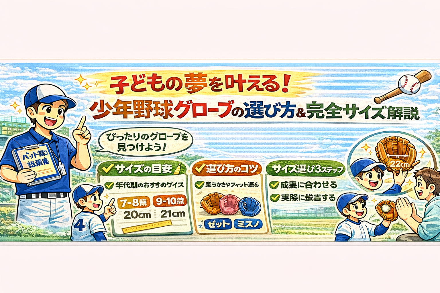 少年野球におけるグローブの選び方は、子どもの成長段階やポジションによって様々です。手に合ったサイズのグローブを選び、素材や機能面も考慮することが重要です。また、グローブの適切な手入れを怠らず、子どもの能力向上をサポートしましょう。本記事が、お子さまにとって最適なグローブ選びの一助となれば幸いです。