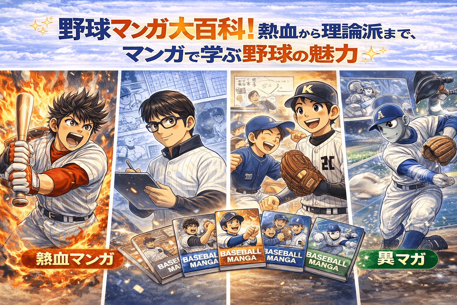 いかがでしたでしょうか。本日は野球マンガの世界を、多様なジャンル、人気作品、個性的な主要キャラクター、様々な舞台設定、野球への独自の捉え方という6つの切り口から紹介しました。