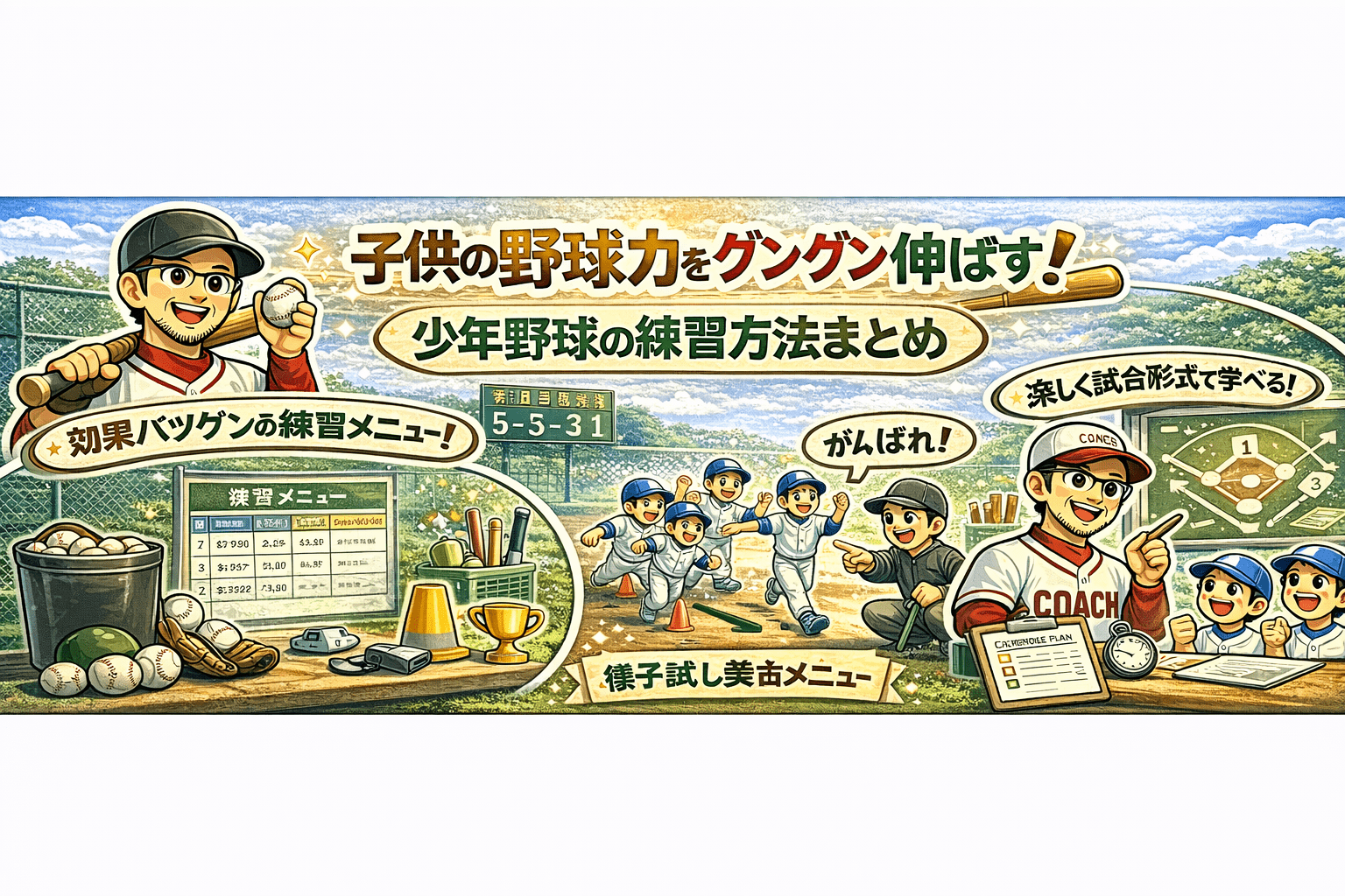 少年野球の基本となる練習メニューから、打撃や守備、体力作り、メンタルケアに至るまで、様々な観点から練習方法を紹介してきました。適切な指導と継続が何よりも大切なのは言うまでもありません。