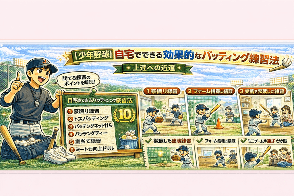 はじめに 少年野球におけるバッティング練習は、選手の技術向上と成長に欠かせない重要な要素です。しかし、チームの練習時間には限りがあり、自宅での練習が不可欠になります。本記事では、少年野球選手が自宅でバッティング練習を行う際の効果的な方法に... -
